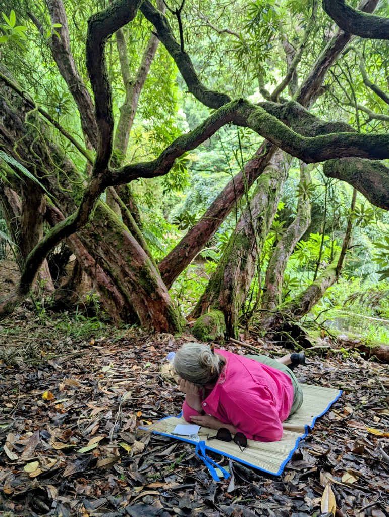 You may be invited to sit or lay on the ground, kneel, bend, walk guided with your eyes closed. Terrain may be uneven and muddy, and will be covered in leaf litter and detritus.